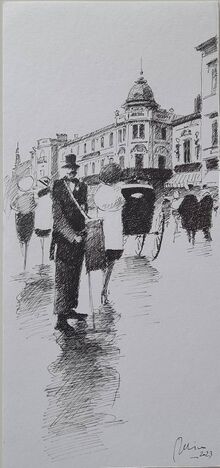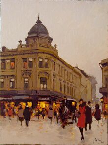 "Localul, masurat de el avea cinci pasi latime si doisprezece lungime. Intrarea era prin Calea Victoriei colt cu str. Edgar Quinet. De o parte si de alta, cite opt mese de stejar. La fiecare masa, in partea dinlauntru, cite doua scaune tot de stejar. Pe linga pereti canapele. Iar in fund, trei mese, tot asa. Spre Calea Victoriei, o fereastra enorma. Spre Edgar Quinet, inca trei,tot atit de mari. Infund, o oglinda cit peretele, in care te vezi intreg si in care vezi un colt din Calea Victoriei, o bucata din Sarindar si Cercul Militar".