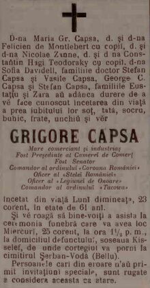 Pe data de 23 Decembrie 1902 Grigore Capsa inceteaza din viata si este inmormantat pe data de 25 decembrie, acelasi an.