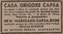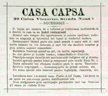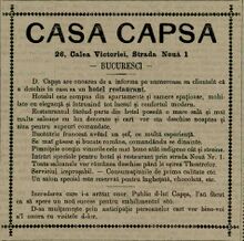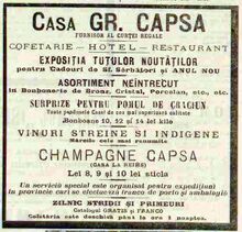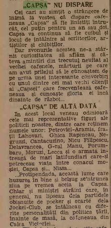 "In anul 1905 „Casa Grigore Capşa” şi-a extins activitatea în afara Bucureştiului. Întrucât familia regală îşi petrecea verile la Sinaia, în această staţiune montană se instaurase o atmosferă aristocratică. Deoarece printre cei care îşi petreceau acolo vacanţa se aflau şi mulţi dintre clienţii obişnuiţi ai cafenelei, conducerea firmei a hotărât deschiderea unei sucursale, pe bulevardul Ghica, intitulată „Vila Capşa”, amenajată cu terasă unde concertele erau susţinute de Grigoraş Dinicu. Toată această lume, „uzina de vise de la Capşa” cum o numea un ziarist, dispare odată cu desfiinţarea cafenelei în toamna lui 1936, sacrificată de patronii de atunci ai firmei în vederea lărgirii restaurantului care le aducea mai mare profit, iar cei care se obişnuiseră să facă popasuri cotidiene acolo, să ocupe aceeaşi masă, să salute aceeaşi oameni, să privească strada prin aceeaşi vitrină şi să pornească spre casă de aici, la aceeaşi oră, se vor muta fie peste drum la „Café de la Paix”, fie în Piaţa Palatului, la „Corso”."[1]