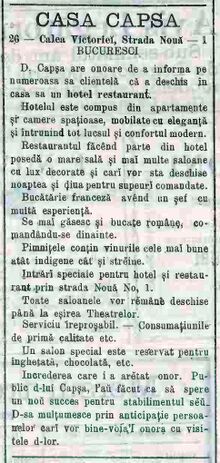 In 1864 Calea Mogosoi Nr. 14 In 1874-75 Callea Mogosoi Nr. 26 In 1886 Calea Victoriei Nr. 26 si Str. Noua Nr. 1 In 1891-93 Calea Victoriei Nr. 48 si Str. Noua Nr. 1 In 1924 Calea Victoriei Nr. 42 In 1929 "Restaurantul Capsa", Str. Edgar Quinet Nr. 1 In 1934 "Cofetaria Capsa", Calea Victoriei Nr. 36 si "Restaurantul Capsa", Calea Victoriei Nr. 36 In 1935 "Hotelul Capsa", Str. Edgar Quinet cu 20 "odai", "Restaurantul Capsa", Str. Edgar Quinet si "Cafeneaua Capsa", Calea Victoriei