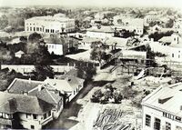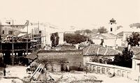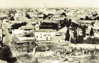 1856 Foto: Ludwig Angerer. Fotografie luata de pe acoperisul Teatrului national spre Str. Stirbei Voievod(azi campineanu). Pasajul Roman in constructie. Pe fundal se vad Bisericile Sf. Ionica, Stejarul, Calvina(in forma initiala din lemn) si Luterana. -