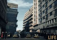 1940 februarie Calea Victoriei, privind spre nord. Pe stanga se poate vedea intrarea in Pasajul Roman inca in picioare. Life Magazine. -