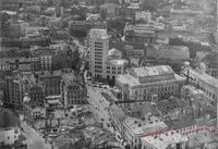 1940 februarie Calea Victoriei, privind spre sud. Pe dreapta se poate vedea intrarea in Pasajul Roman inca in picioare. Blocul Kretzulescu in constructie. Life Magazine. -